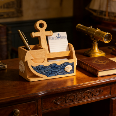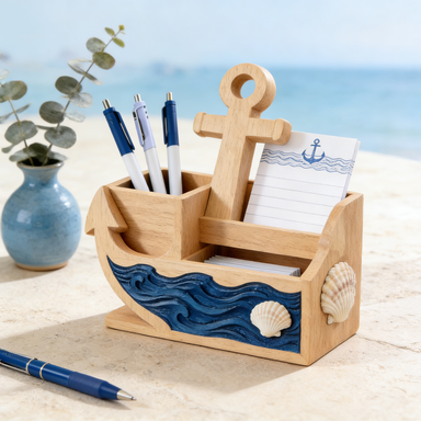 Nautical Wooden Desk Organizer – Anchor & Wave Design Pen & Note Holder