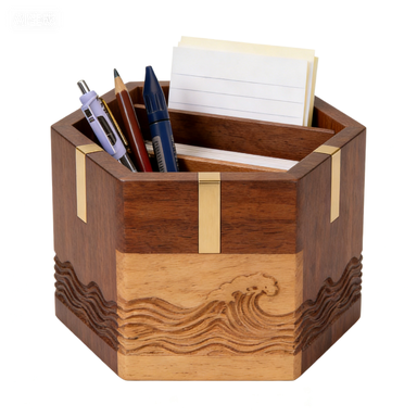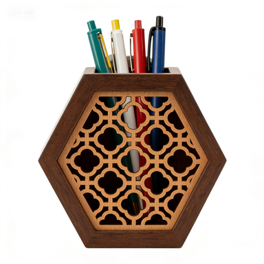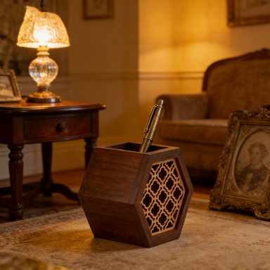 Dark Wood Hexagon Pen Holder – Intricate Carved Pattern for Modern Desk Decor