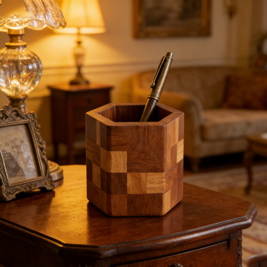 Handcrafted Patchwork Wooden Pen Holder – Hexagon Desk Organizer with Dividers