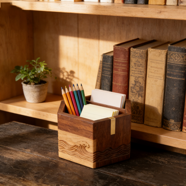 Wave Carved Wooden Desk Organizer – 3-Compartment Pen & Note Holder