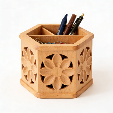 Floral Carved Hexagon Wooden Desk Organizer – 3-Compartment Pen & Accessory Holder